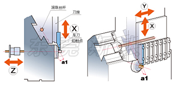 二、大走心機SR-20JIItypeB采用傾斜型燕尾槽導軌構造,這樣切削點近接處X、Y軸構成放射狀,機械剛性提高,還由于滾珠絲桿中心所通過的Y軸導軌是平行的直線與切削點構成近接(右圖a1),減少切削抵抗力矩的負重,使X軸、Z軸方向的刀架臺剛性提高,由于這個斯大自豪的具有專利的刀架臺構造,實行了刀具壽命延長和長時間連續加工時的穩定精度。